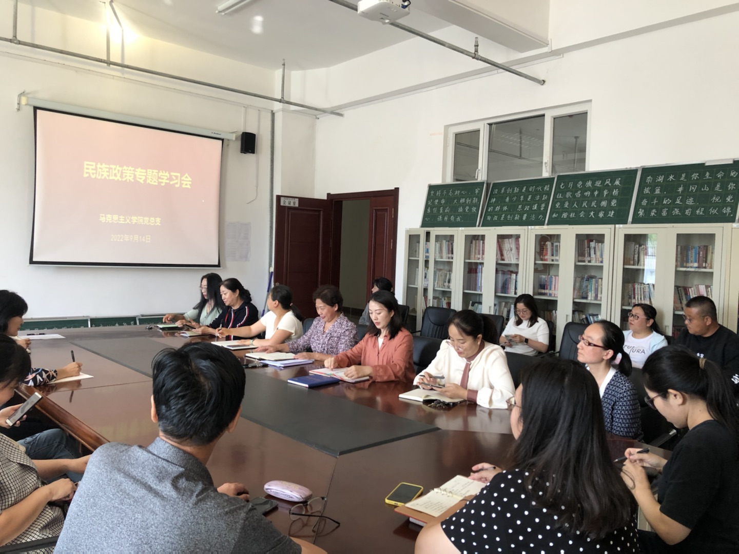 深入开展铸牢中华民族共同体意识教育,促进民族团结进步,2022年9月14日,suncitygroup太阳新城官网党总支理论学习中心组扩大学习会在崇文楼B123会议室召开专题学习。会议由党总支书记刘凤琴主持,学院全体教师参加。会上集中学习了《内蒙古自治区促进民族团结进步条例》、《内蒙古自治区教育条例》和《中华人民共和国国家通用语言文字法》等法律法规,同时要求各位老师自学《民族区域自治法》。