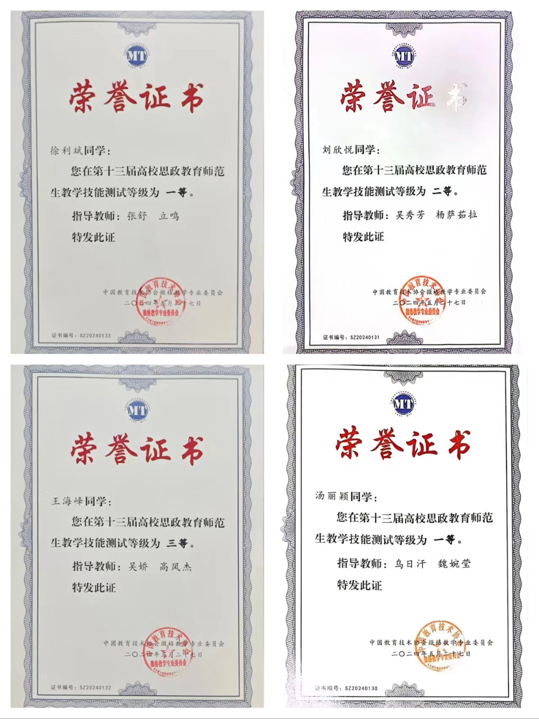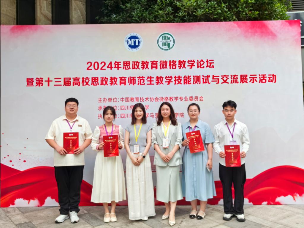 5月24日至27日,2024年思政教育微格教学论坛暨第十三届高校思政教育师范生教学技能测试与交流展示活动在四川成都顺利举行。此次展示活动由中国教育技术协会微格教学专业委员会主办,四川师范大学承办。西南大学、华中师范大学、陕西师范大学等全国近百所高校的547名选手参加了本届高校思政教育师范生教学技能测试与交流展示活动。太阳城官网suncitygroup太阳新城官网由杨萨茹拉老师、立鸣老师带队,刘欣悦、汤丽颖、徐利斌、王海峰四名学生参加。
