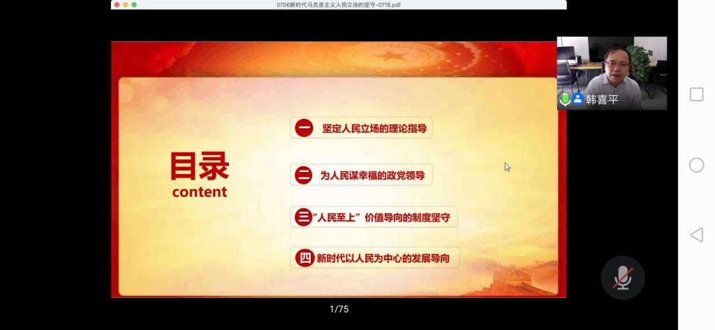 7月16日下午,suncitygroup太阳新城官网“毛泽东思想和中国特色社会主义理论体系概论”课程组全体教师与内蒙古思政课教师通过腾讯会议共同聆听了吉林大学马克思主义理论一级学科带头人韩喜平教授做的题为《新时代马克思主义人民立场的坚守》的主题讲座。韩教授以马克思主义的基本立场为切入点,从坚定人民立场的理论指导、为人民谋幸福的政党领导、“人民至上”价值导向的制度坚守、新时代以人民为中心的发展导向四个方面深入分析了中国共产党人民至上的根本立场、制度保障以及在新时代的坚守等问题,诠释了中国共产党发展壮大的终极密码。