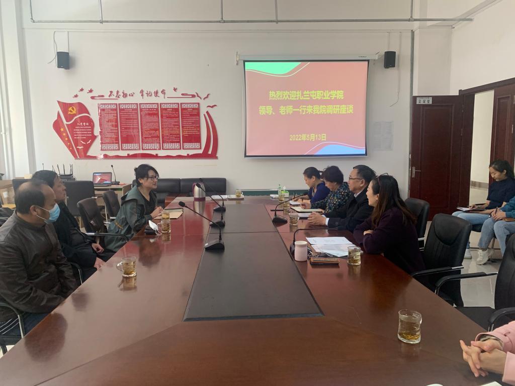 2022年5月13日,扎兰屯职业学院党委副书记任林宏,宣传部部长、马克思主义教研部主任王虹和马克思主义教研部孟凡祥一行三人来我院调研座谈,太阳城官网党委副书记张国栋、suncitygroup太阳新城官网党总支书记刘凤琴、院长李俏、副书记刘琳、副院长吴秀芳、团学办、综合办和系部主任、课程负责人参加了座谈会。