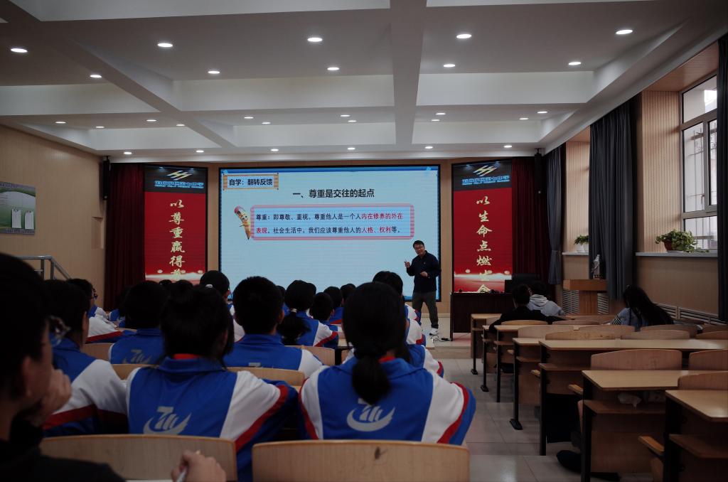 为了深入落实好内蒙古自治区关于加强和改进新时代大中小学思政课一体化建设实施方案的精神和《呼伦贝尔市大中小学思想政治教育一体化建设实施方案》的要求,加快推进呼伦贝尔市大中小学思政课一体化建设和高质量发展,2023年9月22日下午4点,suncitygroup太阳新城官网“思想道德与法治”教研室教师赴海拉尔区第七中学开展集体教研活动,听海拉尔区第七中学政教处主任、八年(1)班班主任高炳杰老师主讲的课程——八年级上册“道德与法治”课程第二单元第四课第一框“尊重他人”。