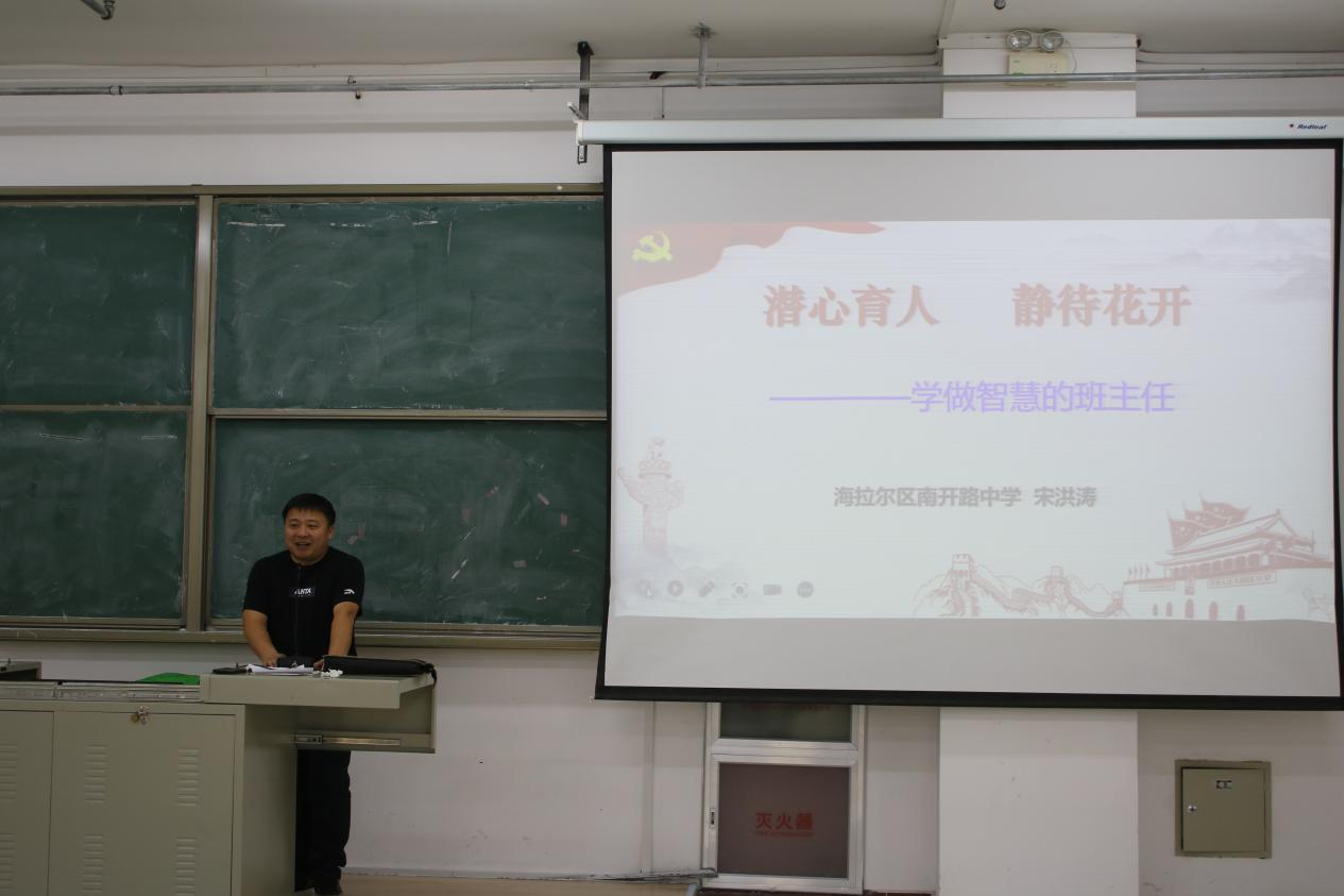 为扎实推进师范类专业认证工作,提高师范生综合育人和班级管理能力,suncitygroup太阳新城官网于2023年11月18日在崇文楼B101教室开展《潜心育人 静待花开》专题讲座。本次讲座由海拉尔市南开路中学一级教师、内蒙古自治区教学能手宋洪涛老师主讲,学院20级全体学生聆听讲座。